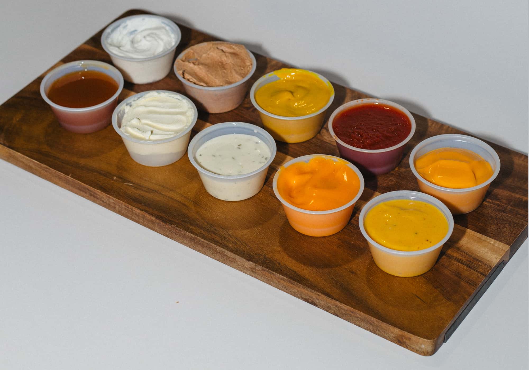 Mustard. Honey Dijon Mustard. Marinara. Cheddar. Nacho. Cream Cheese. Fluffy. Ranch. Cinnamon Butter.